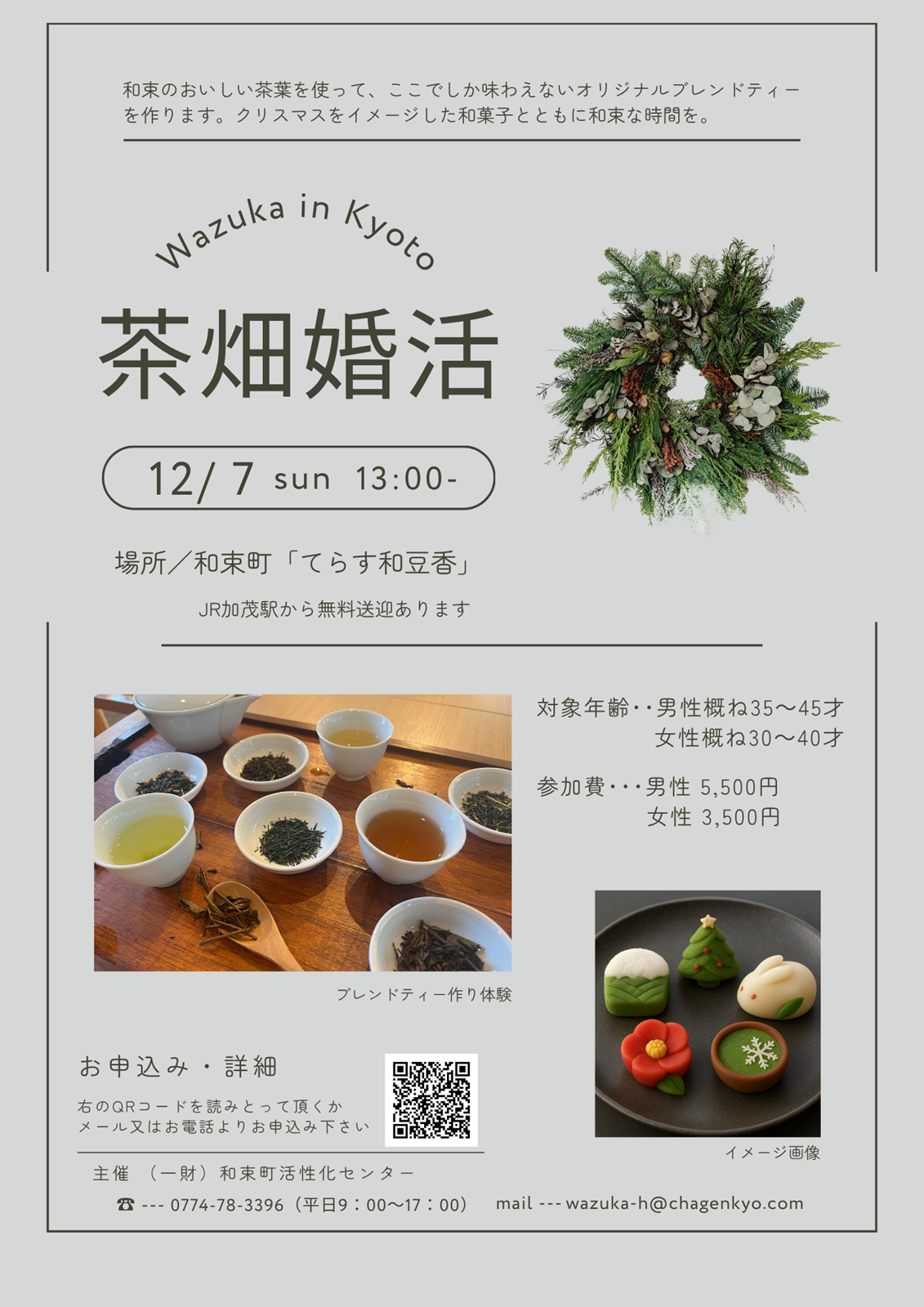 また、メール(wazuka-h@chagenkyo.com)や電話(0774-78-3396 平日 9:00~17:00)でも受け付けております。