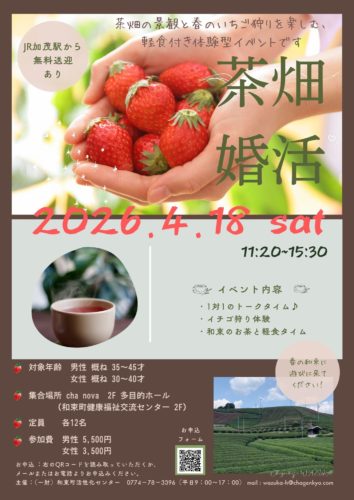 さらに詳しく »今年の春も、婚活イベントを開催いたします。 茶源郷と呼ばれる茶畑に囲まれたお茶の町で 素敵な出会いが見つかりますように・・・ 和束町の婚活イベントは体験型です。 軽食付き! じっくり話せるトークタイムと、今…